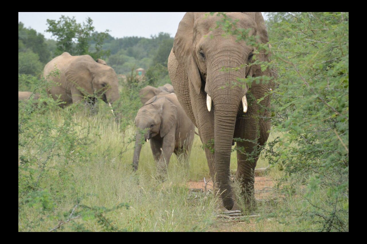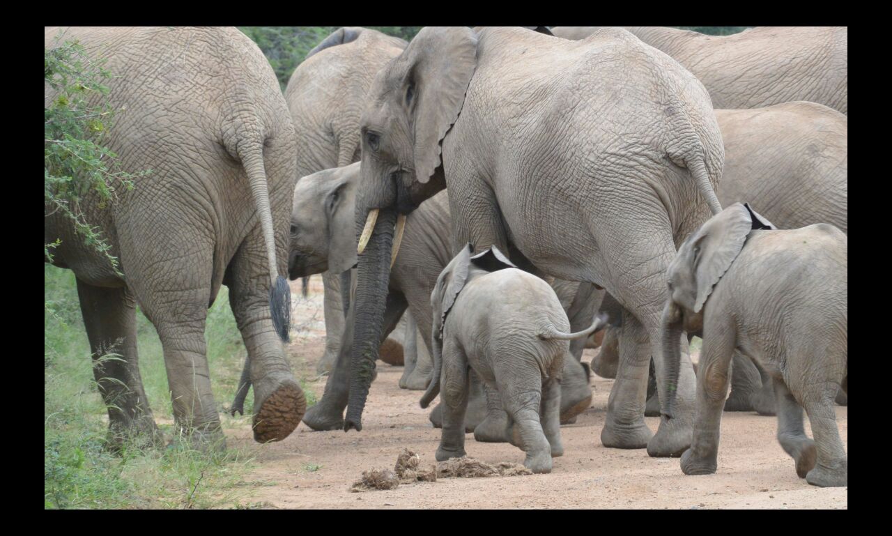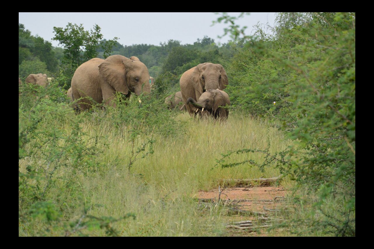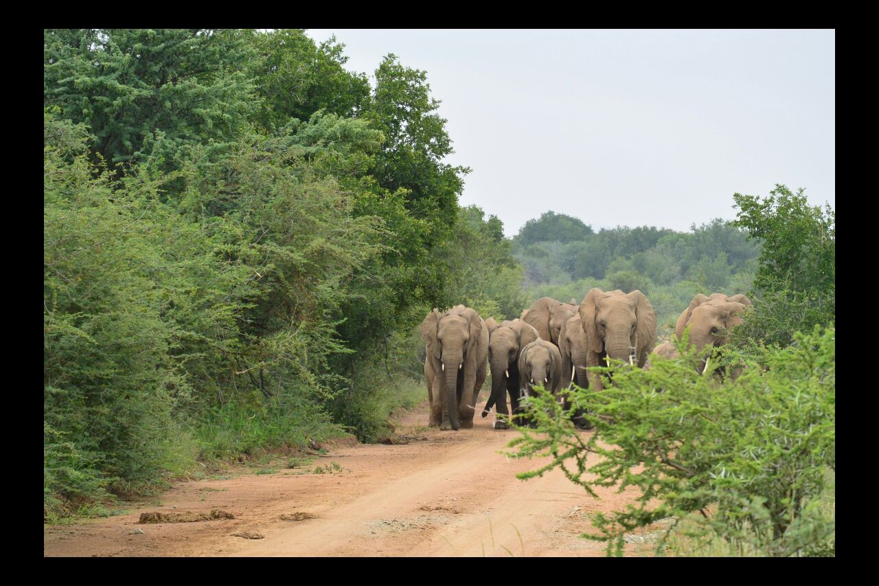 One of the highlights, possibly the highlight of the weekend, is when we come to a cross road and looking to our right we see a herd of elephants making their way down the road, we stay put and they keep coming.
