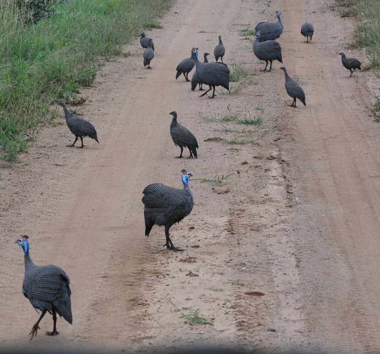 Next we spot some water buffalo hiding in the shrubs, they are rather elusive, but we see a few staring back at us through the thicket. Blue guinea fowl are strutting down the road, the blue necks are a striking colour.